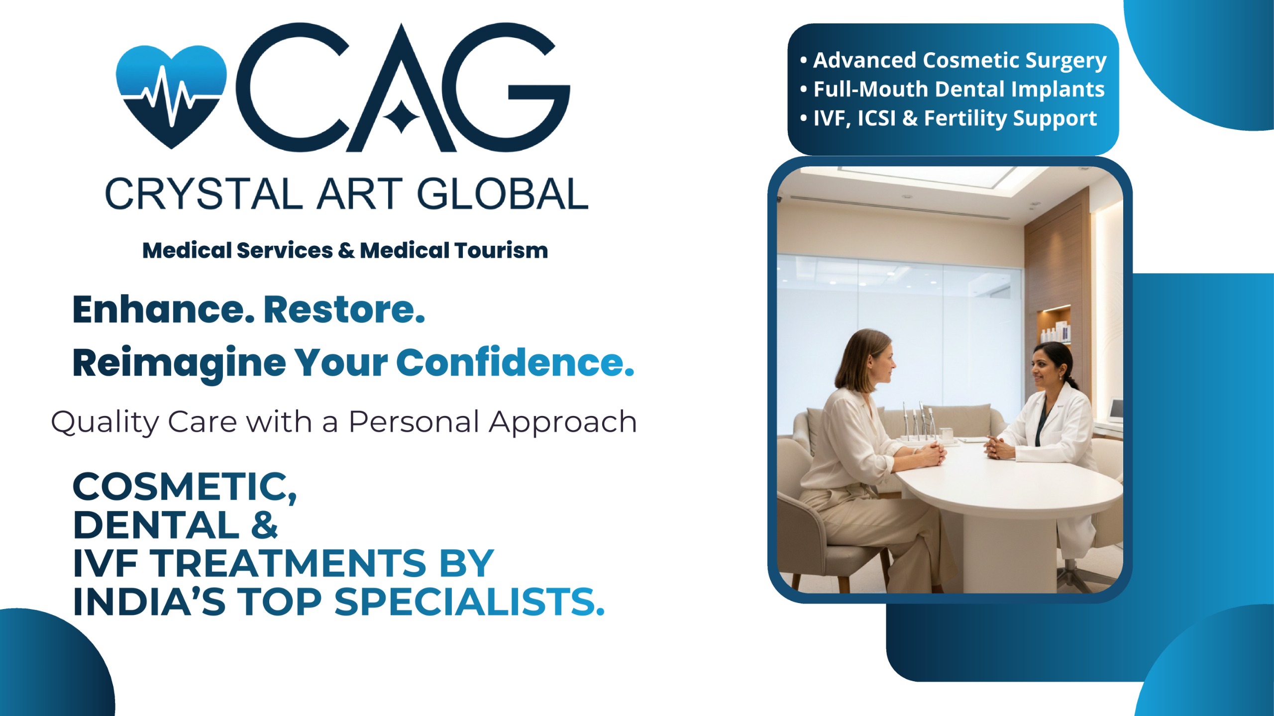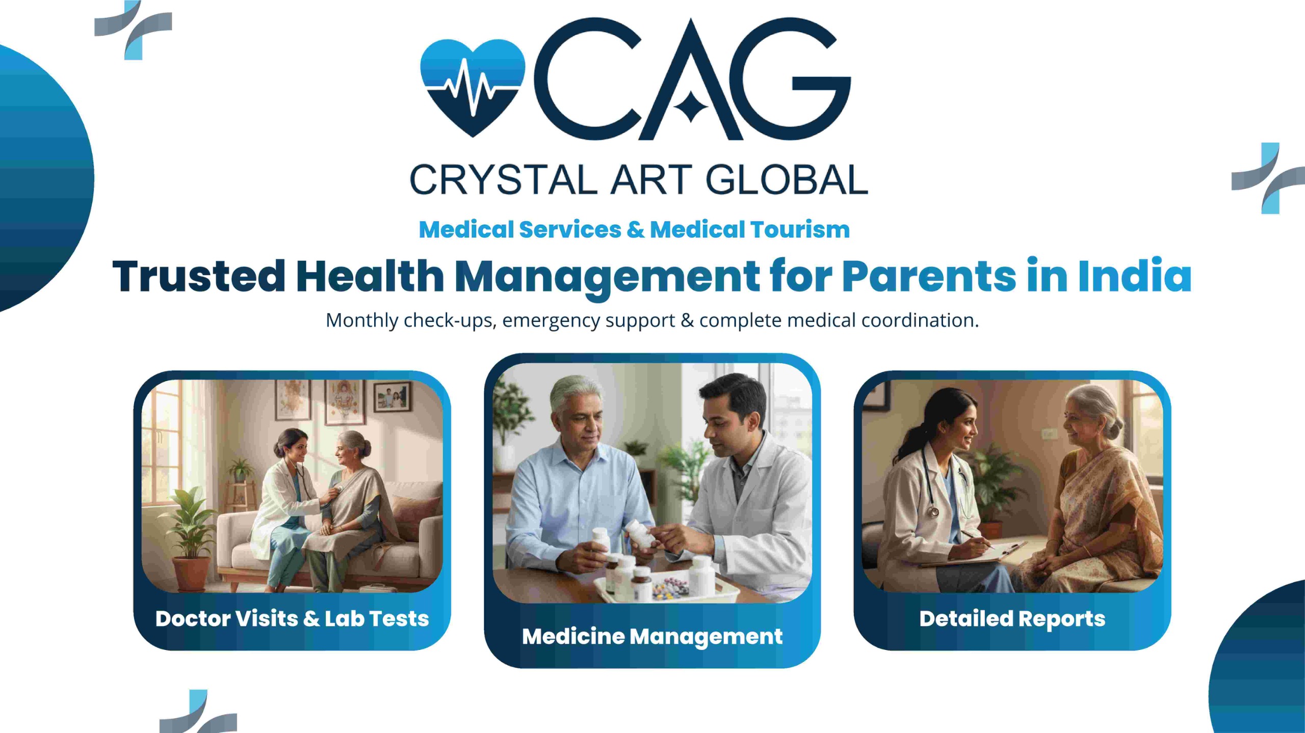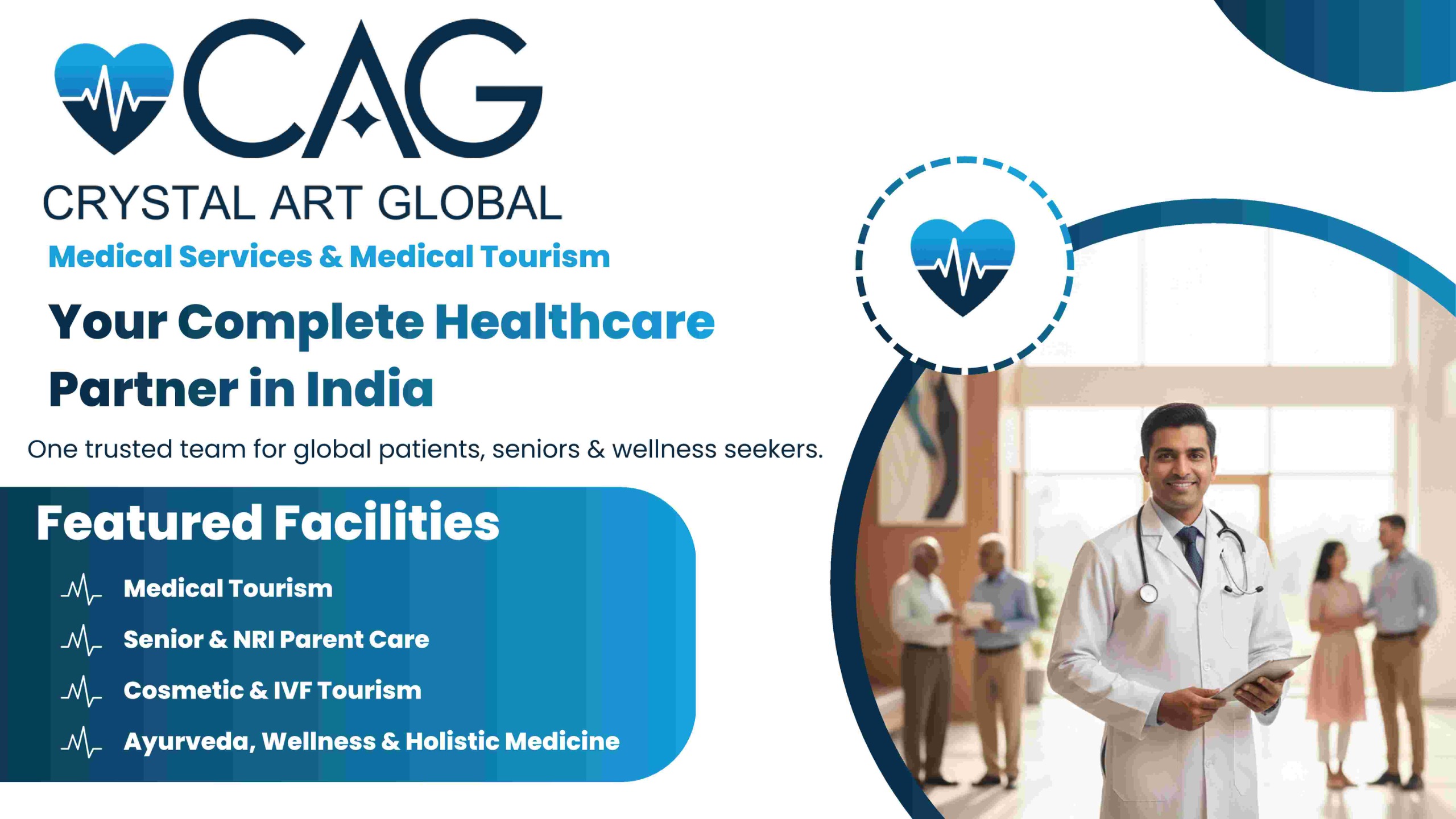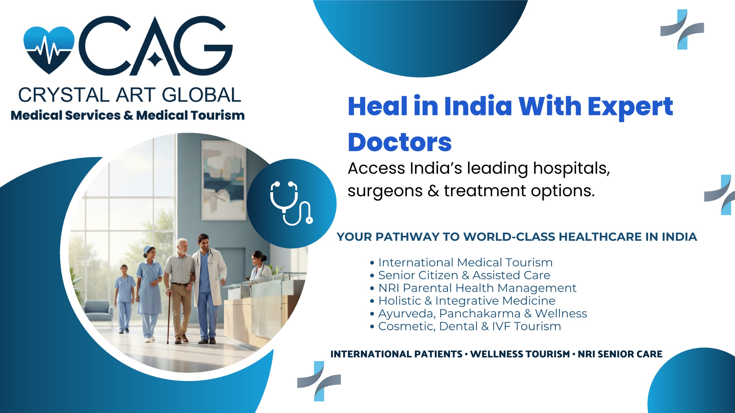 Crystal Art Global helps international patients, NRIs, and their families access world-class medical treatment, wellness therapies, and senior care services in Mumbai and across India. From medical opinions and surgery planning to wellness retreats and NRI parent care, we provide end-to-end support with complete transparency, compassion, and responsibility.